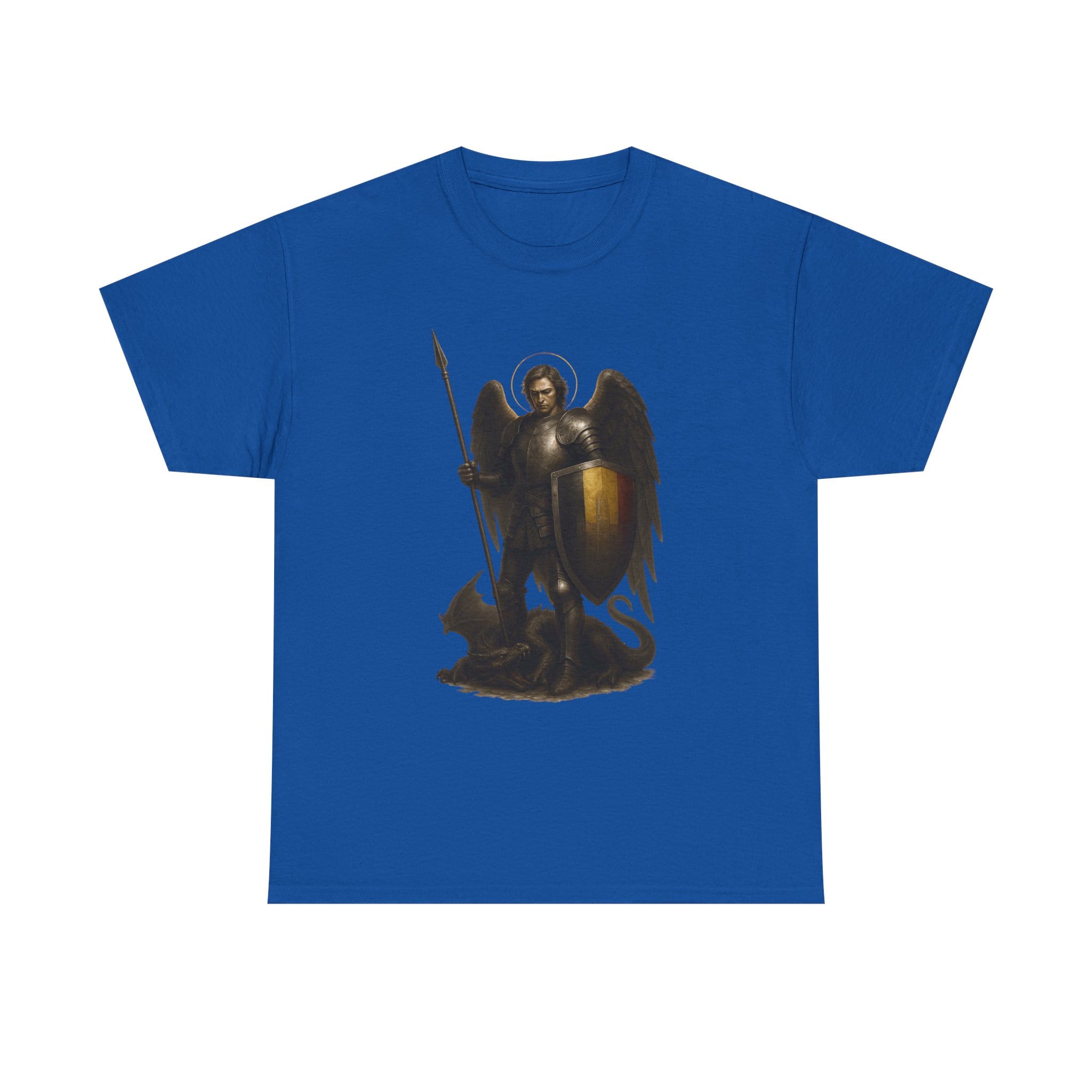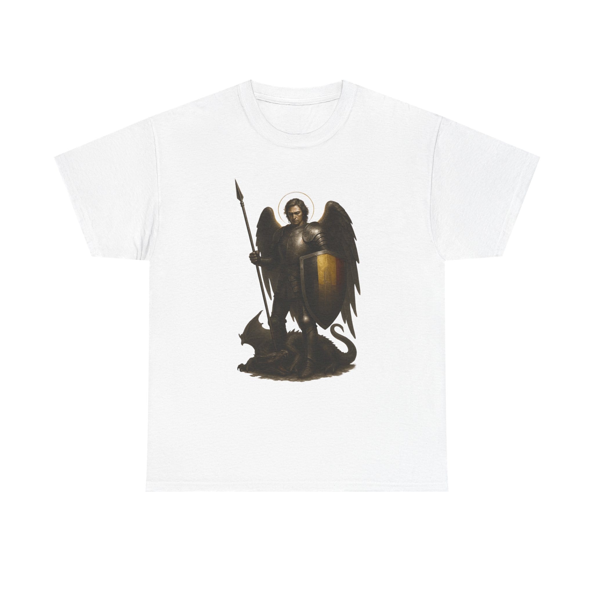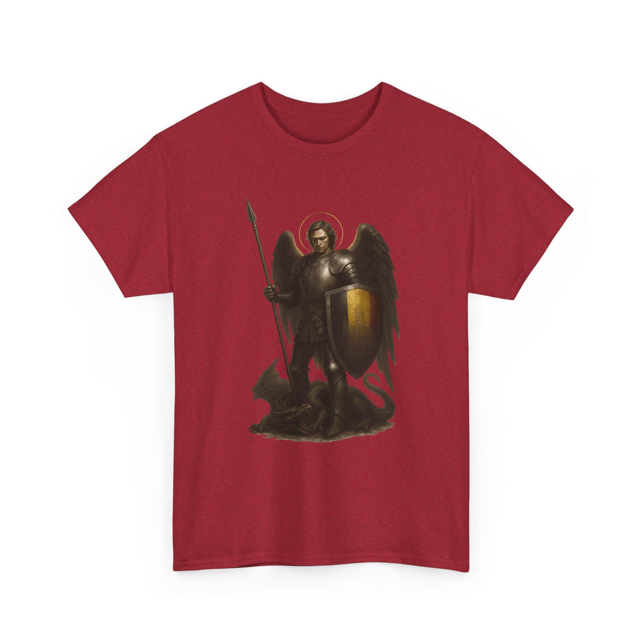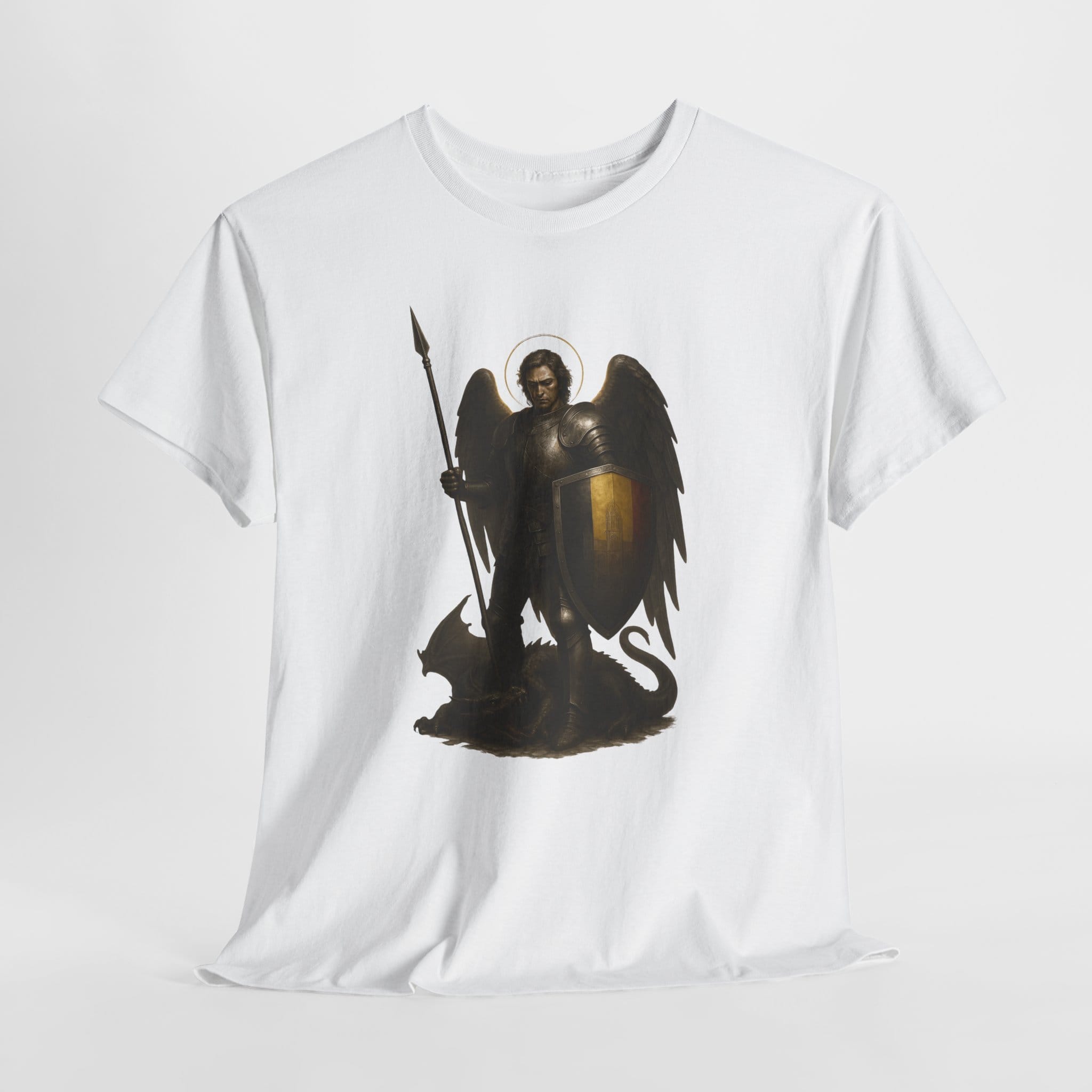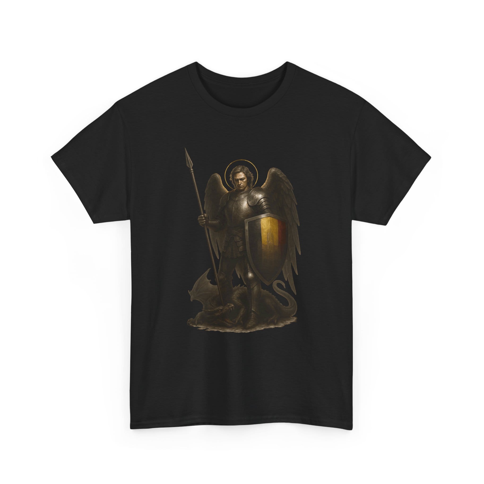 Wearing this design is a reminder that every day calls for a form of inner knighthood. It invites you to act with integrity, to protect those entrusted to you, and to cultivate calm strength in the face of uncertainty. Let the angelic halo and grounded posture inspire you to approach life with dignity, discipline, and purpose. This shirt is for those who believe that tradition lives on through the virtues we practice and the example we set.