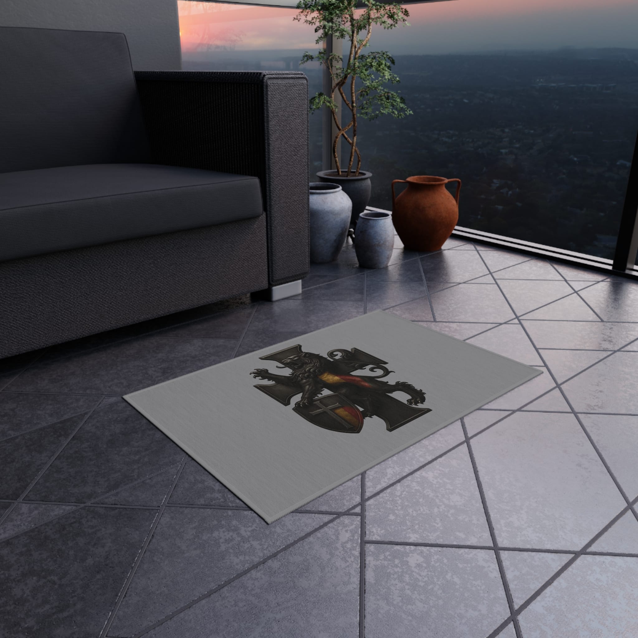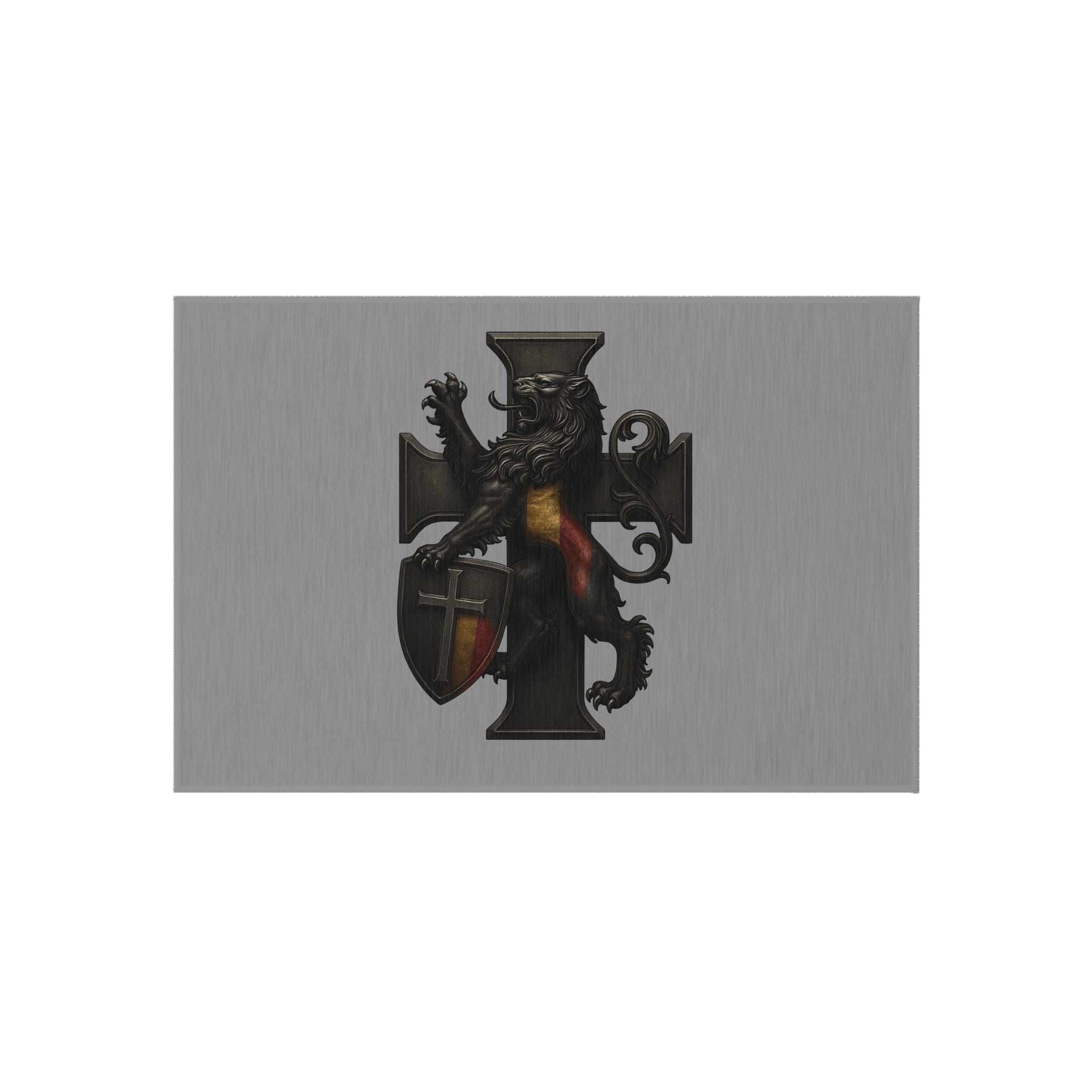 The Belgian lion standing atop the iron cross gives this outdoor rug a timeless atmosphere of structure, discipline, and noble identity. Perfect for patios and garden seating areas, it grounds your environment in stability. The imagery speaks quietly but firmly: order is something we build, and heritage is renewed in the home.