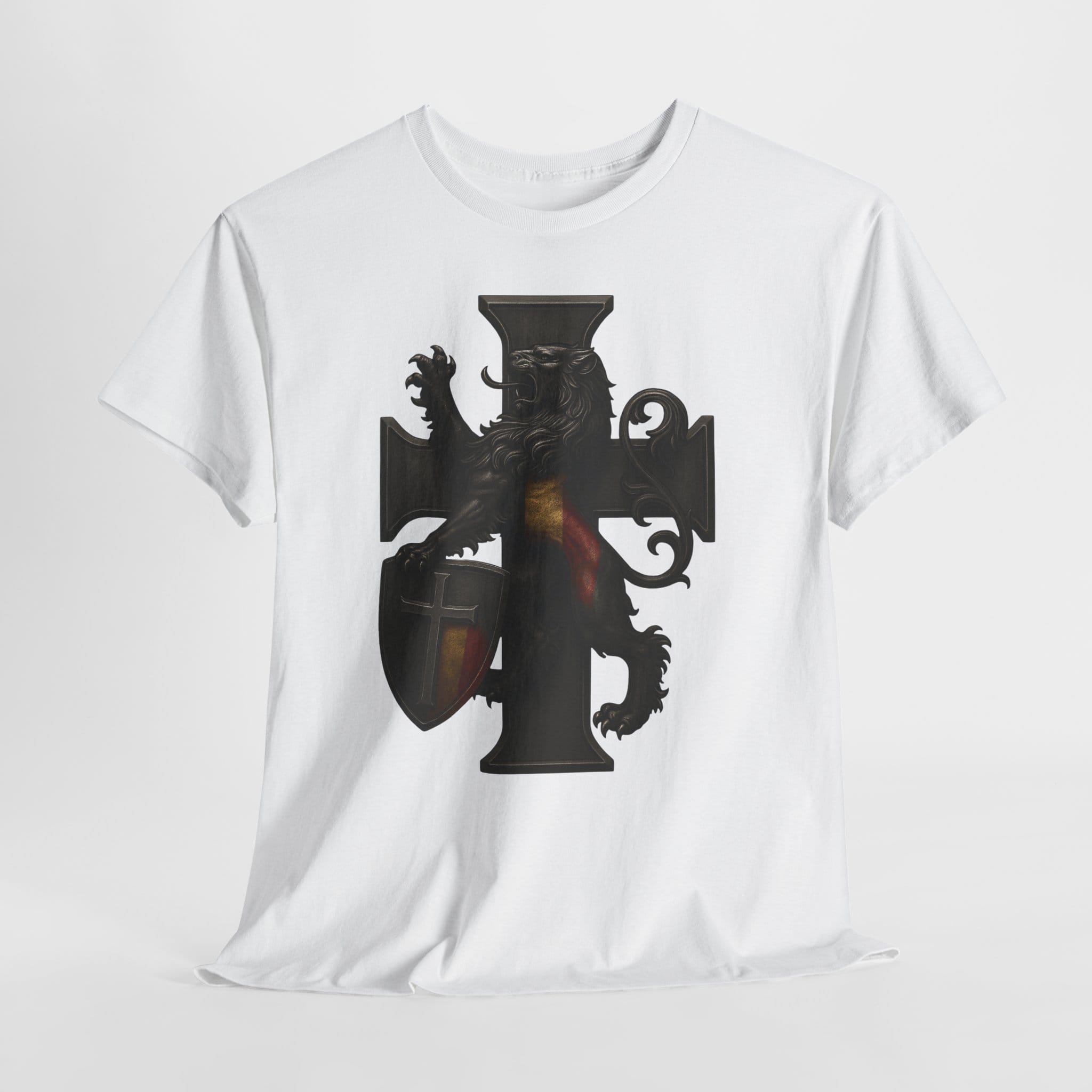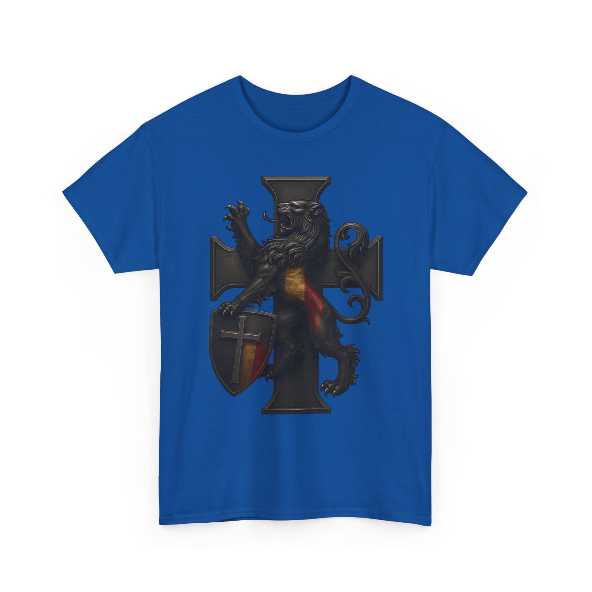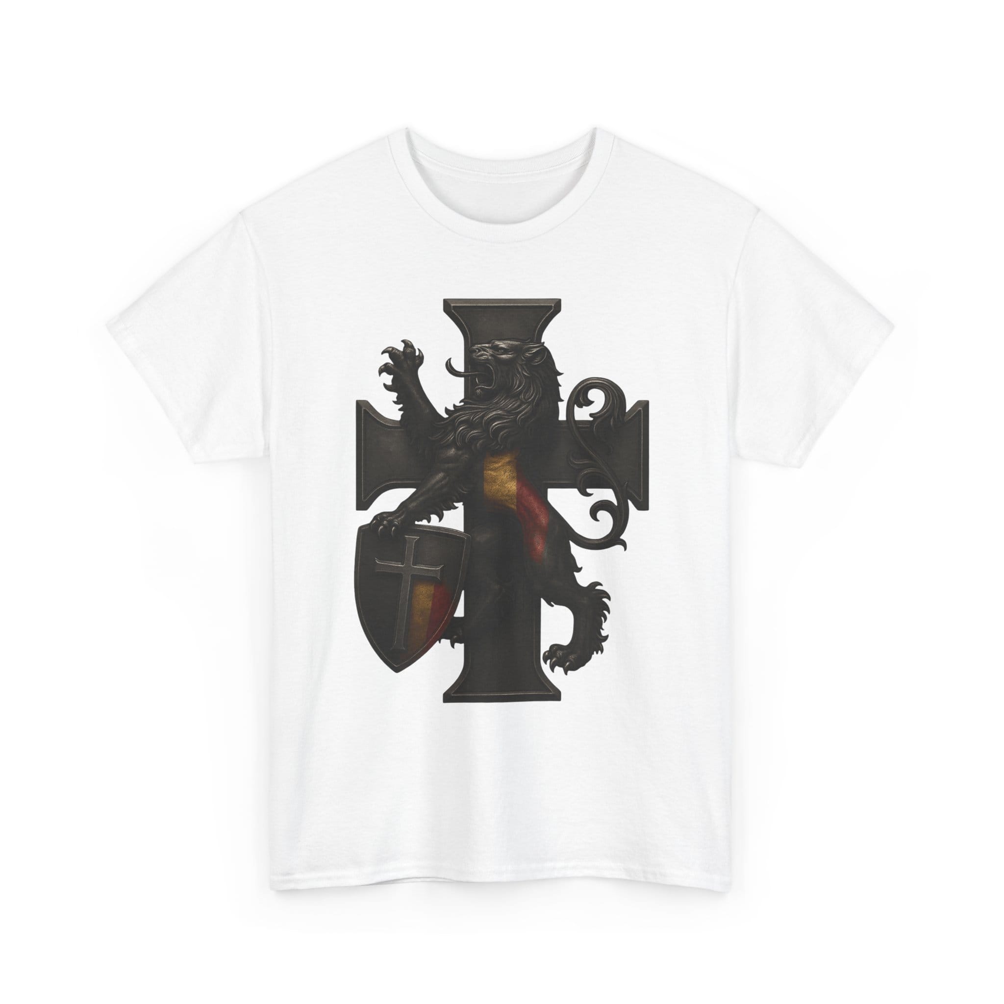 Wearing this shirt brings a sense of grounded identity into your daily life. It encourages you to live deliberately—organizing your world, strengthening your bonds, and cultivating the habits that support a stable and meaningful home. Let the lion’s steadfast stance and the structured cross inspire you to bring order to your routines and dignity to your decisions. This garment is not about the past alone; it’s about renewing tradition through the choices you make today.
