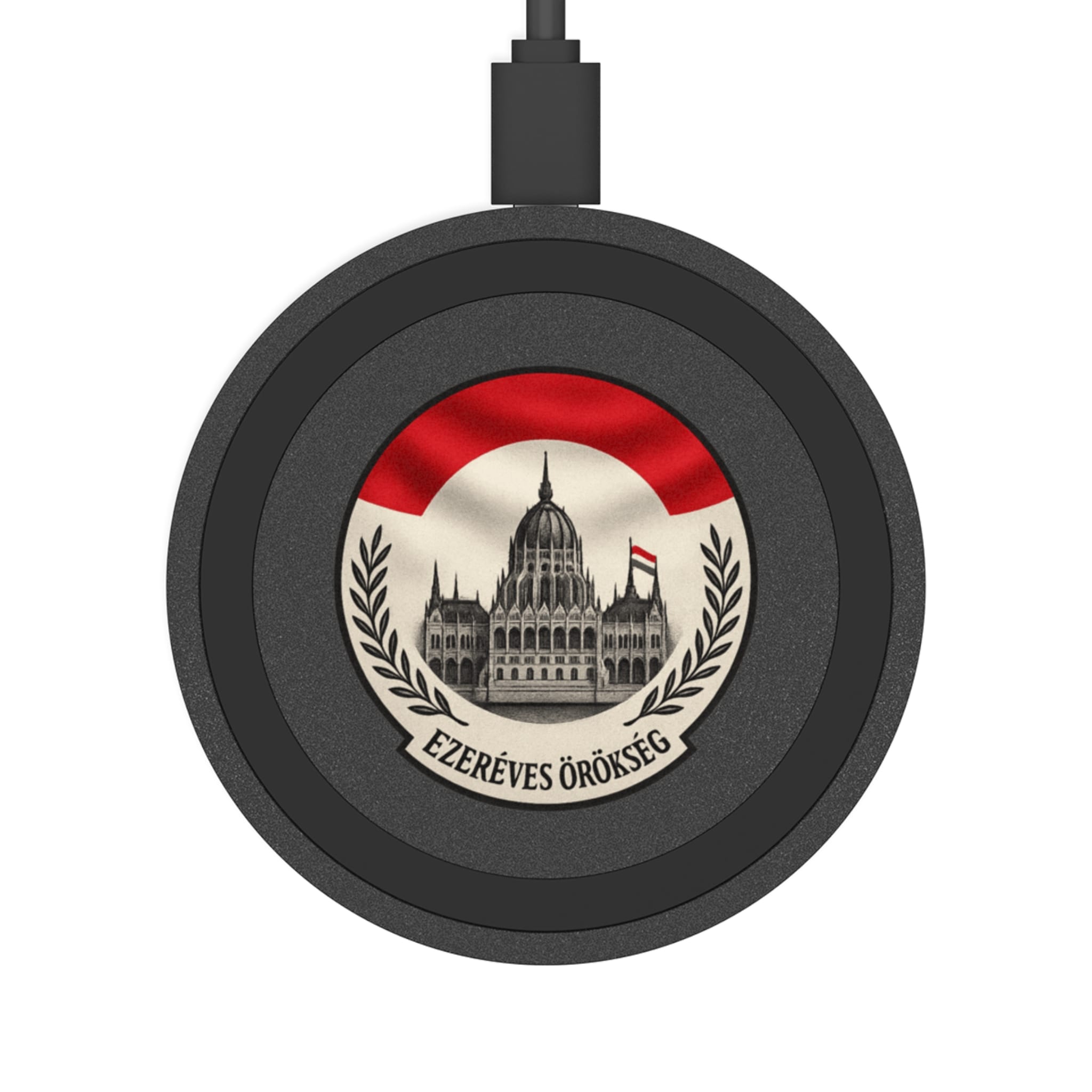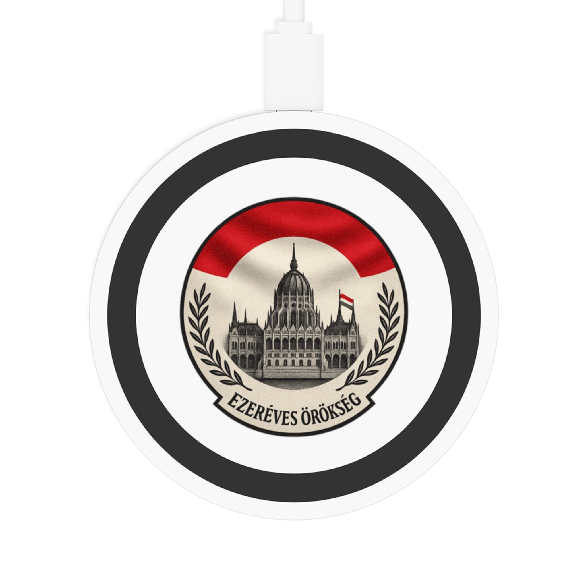 Turn an everyday moment into a quiet act of remembrance. This wireless charging pad features the Ezeréves Örökség emblem — the Hungarian Parliament crowned with the tricolor and framed by laurel branches, symbolizing a millennium of continuity. When you set your phone down, you’re placing it on a reminder that your life is part of a long, unbroken story.