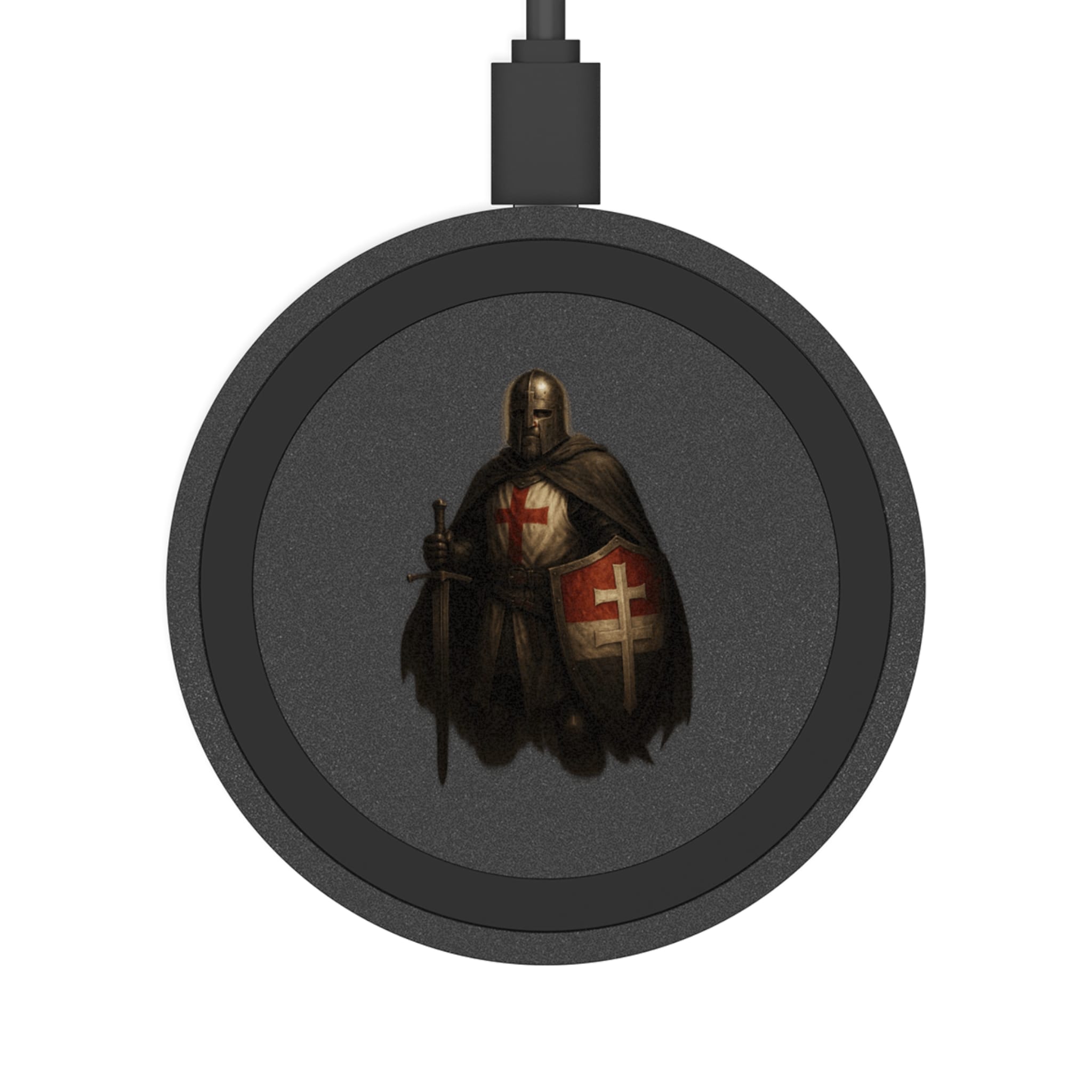 Here, the Hungarian knight stands steady and luminous — shield marked with the double cross, posture dignified, halo signaling humility behind strength. On a charging pad, this figure becomes a symbol of inner resolve: the courage to do what is right, the discipline to stay the course, and the patience to endure.