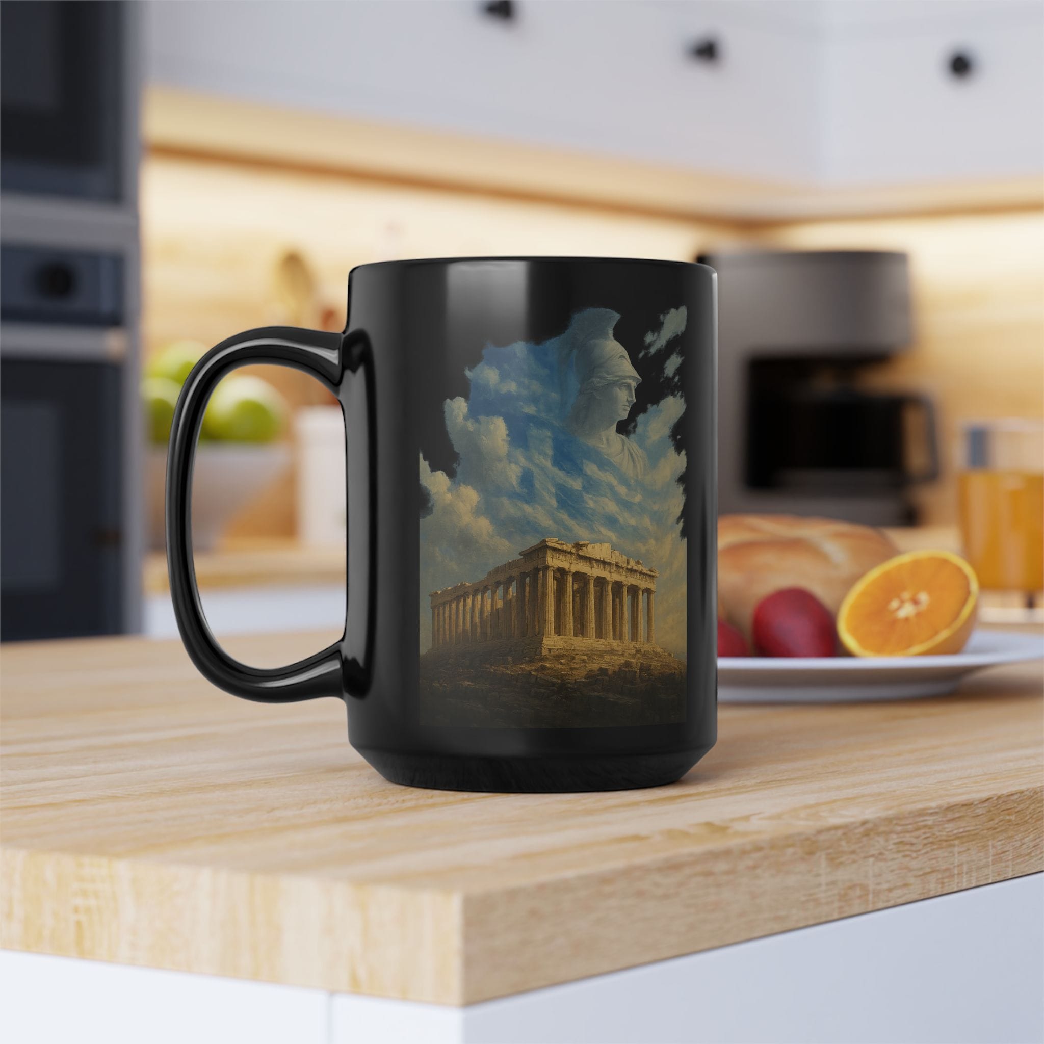 The Parthenon glows like a jewel against the black ceramic backdrop, with Athena’s calm presence watching from above. This mug pays homage to the foundations of civilization — wisdom, justice, harmony, and the pursuit of excellence.